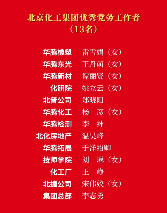 為熱烈慶祝中國共產(chǎn)黨成立103周年,大力表彰在推進(jìn)“十四五”規(guī)劃、推動集團(tuán)“231”戰(zhàn)略布局、完成重點(diǎn)工作任務(wù)等各方面涌現(xiàn)出來的先進(jìn)集體和先進(jìn)個人,市國資委黨委決定,授予北搪黨委“先進(jìn)基層黨組織”稱號,授予技師學(xué)院姜洪強(qiáng)“優(yōu)秀共產(chǎn)黨員”稱號,授予北京化工集團(tuán)總部李志勇“優(yōu)秀黨務(wù)工作者”稱號;北京化工集團(tuán)黨委決定,授予14個黨支部“先進(jìn)基層黨支部”稱號,授予29名同志“優(yōu)秀共產(chǎn)黨員”稱號,授予13名同志“優(yōu)秀黨務(wù)工作者”稱號。